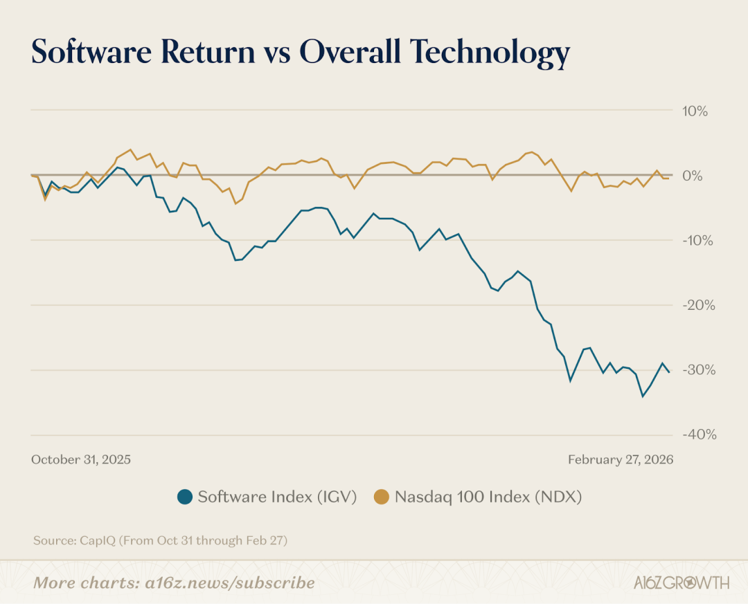 今年年初以来,一批我们耳熟能详的大型软件公司股价跌了将近30%,有人把这波下跌叫做「SaaSpocalypse」——软件行业的末日。逻辑听起来很简单,AI让写代码变得极其便宜,人人都能一句话做一个应用,软件公司还值什么钱?