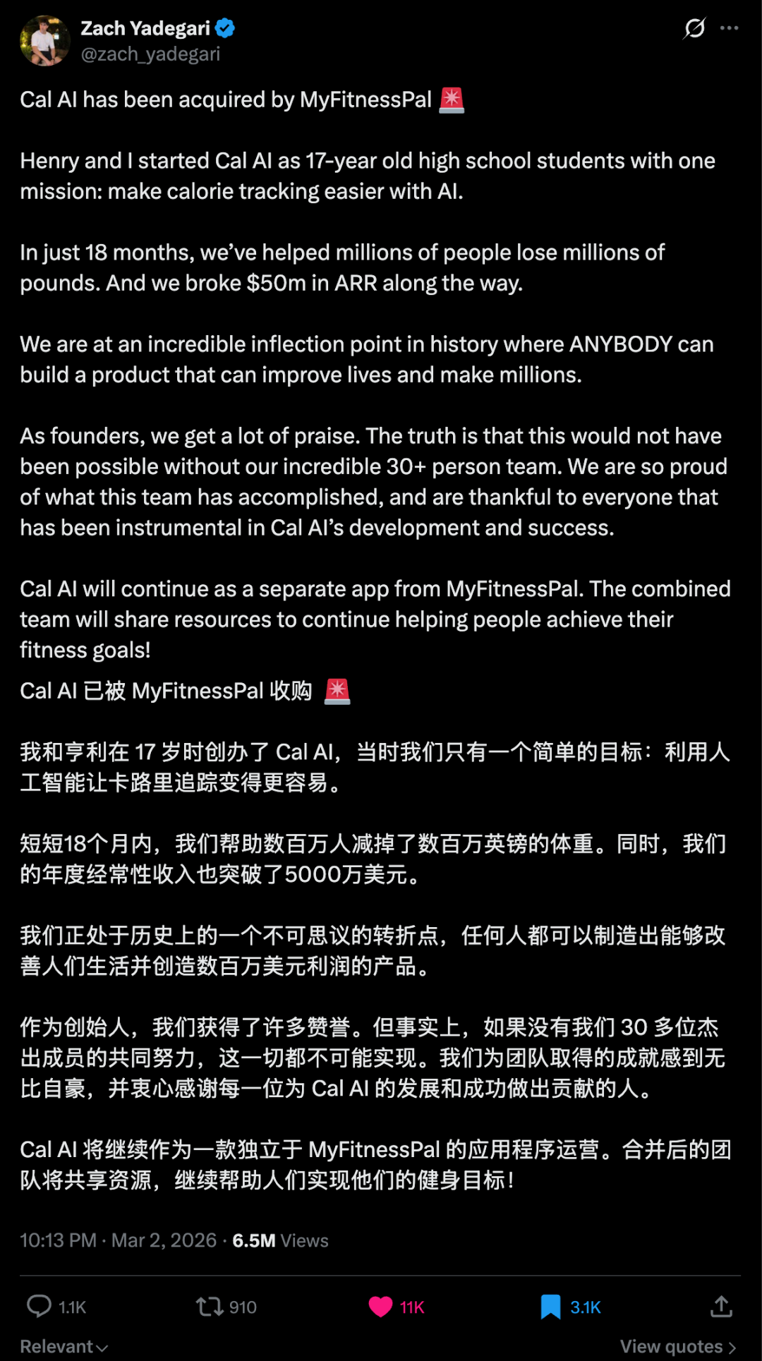 19岁的两名高中生,开发了一款AI卡路里追踪应用Cal AI,年收入超3000万美元,前段时间被知名公司MyFitnesssPal收购,具体收购价没有公开,但俩小伙子显然已经赢麻了。