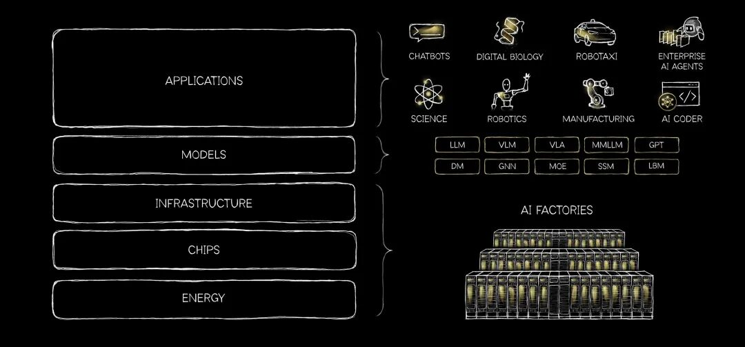 他最近在英伟达官方账号发文,再次提到他的AI五层蛋糕架构:能源→芯片→基础设施→模型→应用,核心逻辑就在于AI不再是传统的预制软件,更多的是一个实时生成智能的工业产品。