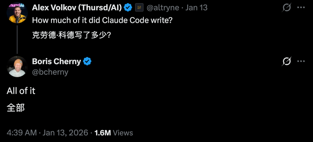 这种现象无论是在行业内外,都变得流行起来。早在年初Claude Cowork的发布,Claude Code相关负责人,就在X回复网友,所有的代码都是由AI辅助完成。
