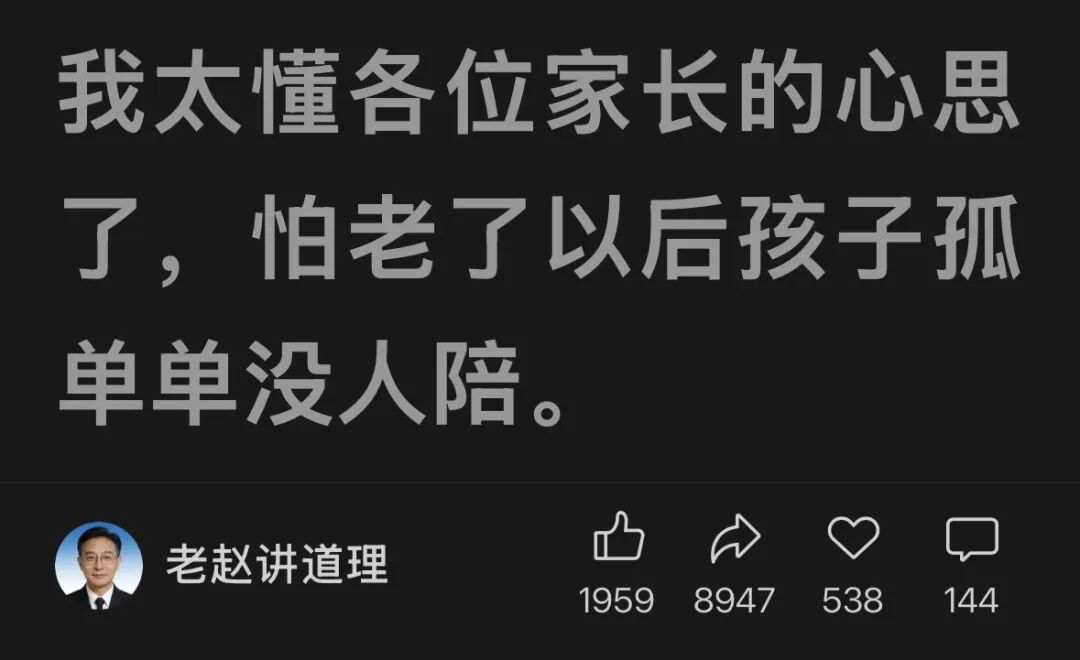 在《父母越催婚,孩子越不容易收获幸福》中,作者老赵先是用超大字体共情了催婚的家长“我太懂各位家长的心思了,怕老了以后孩子孤单单没人陪”。
