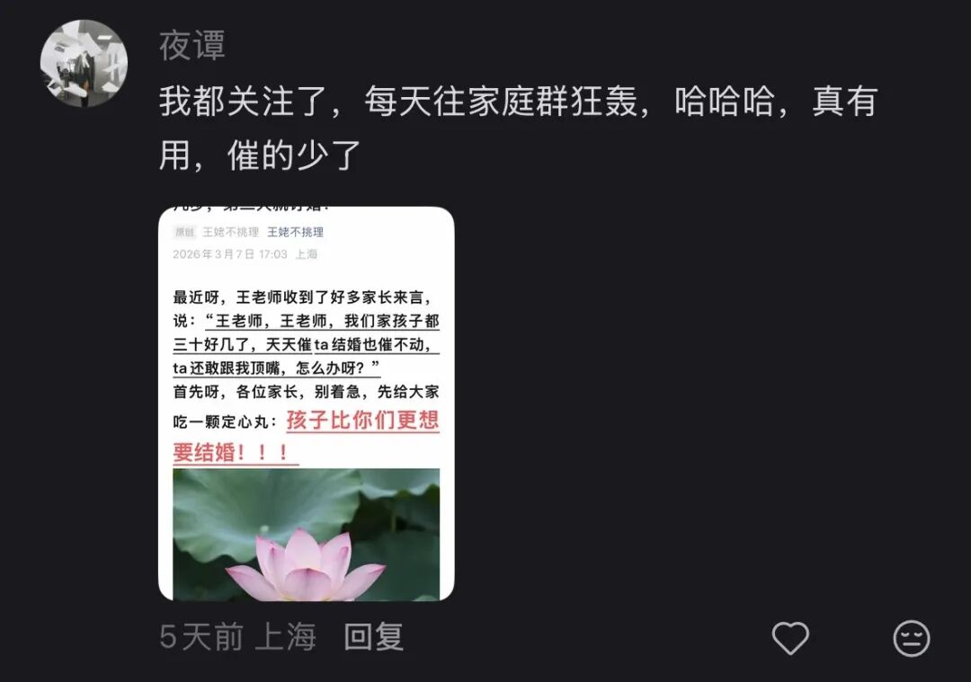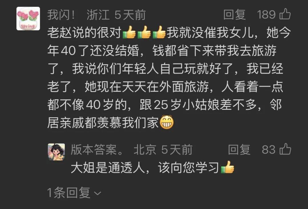 比起年轻人面对催婚的“不听不听,王八念经”,这招确实管用不少。评论区有很多正面评论:不催了以后,跟孩子的关系越来越融洽了;儿孙自有儿孙福;我就没催我女儿,她今年40了看着跟25岁小姑娘差不多。