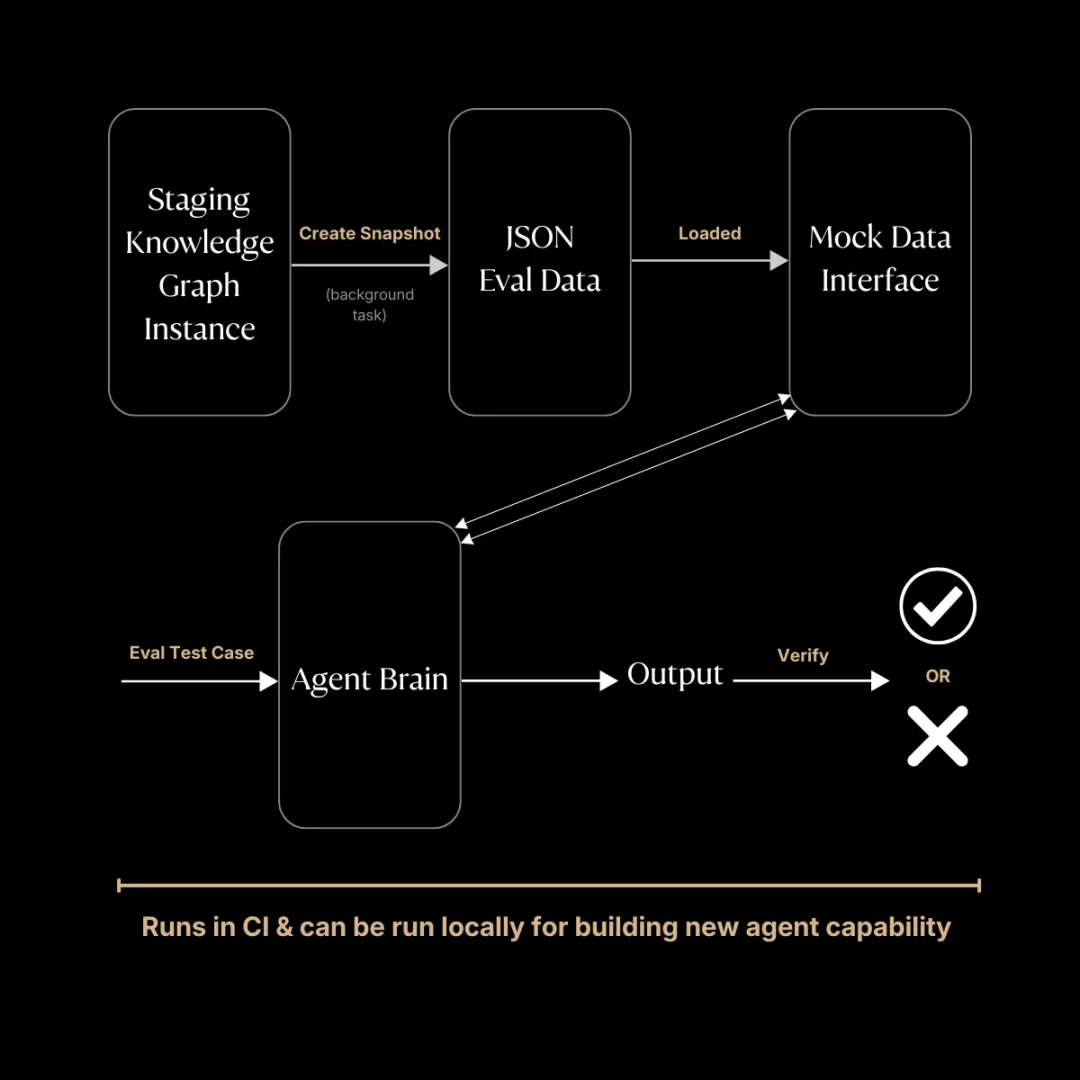 对于评估(eval),Rox AI通过对staging数据运行聚合knowledge graph查询来快照真实环境。后台任务执行这些查询,并将结果写入单个JSON文件,该文件代表销售人员CRM在该时间点的完整状态:他们的联系人、公司、机会、最近的邮件、会议、记录。一个文件捕获了agent可能询问的所有内容。评估运行器加载这个JSON并将LiveDataInterface替换为MockDataInterface。从agent的角度来看,什么都没有改变。它调用相同的方法和相同的签名,但不是访问Knowledge Graph,而是从快照中读取。这使得评估变得可重复和可控,开发者可以在每次代码提交时运行eval,或者在本地修改提示、更换模型、重构编排逻辑,并立即看到性能是提高还是下降。