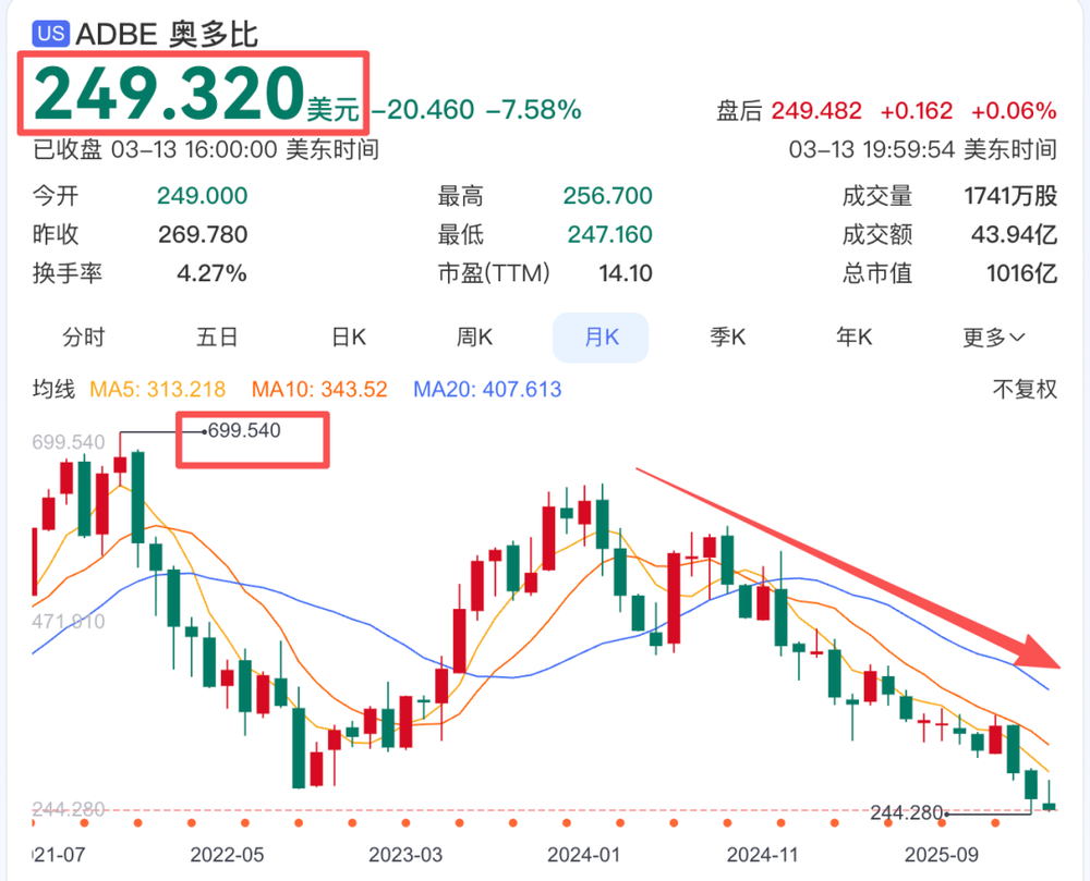 作为曾经全球市值最高的专业SaaS公司,Adobe在2026年股价已经下跌了近30%,市值和高峰期相比,缩水了超过三分之二。