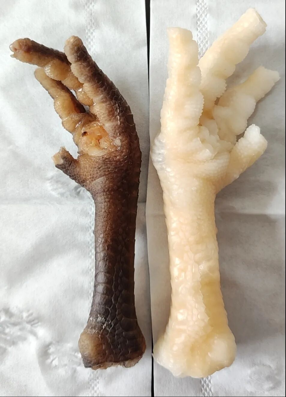 △处理前后鸡爪对比(左图为处理前,右图为处理后)/时代周报记者摄