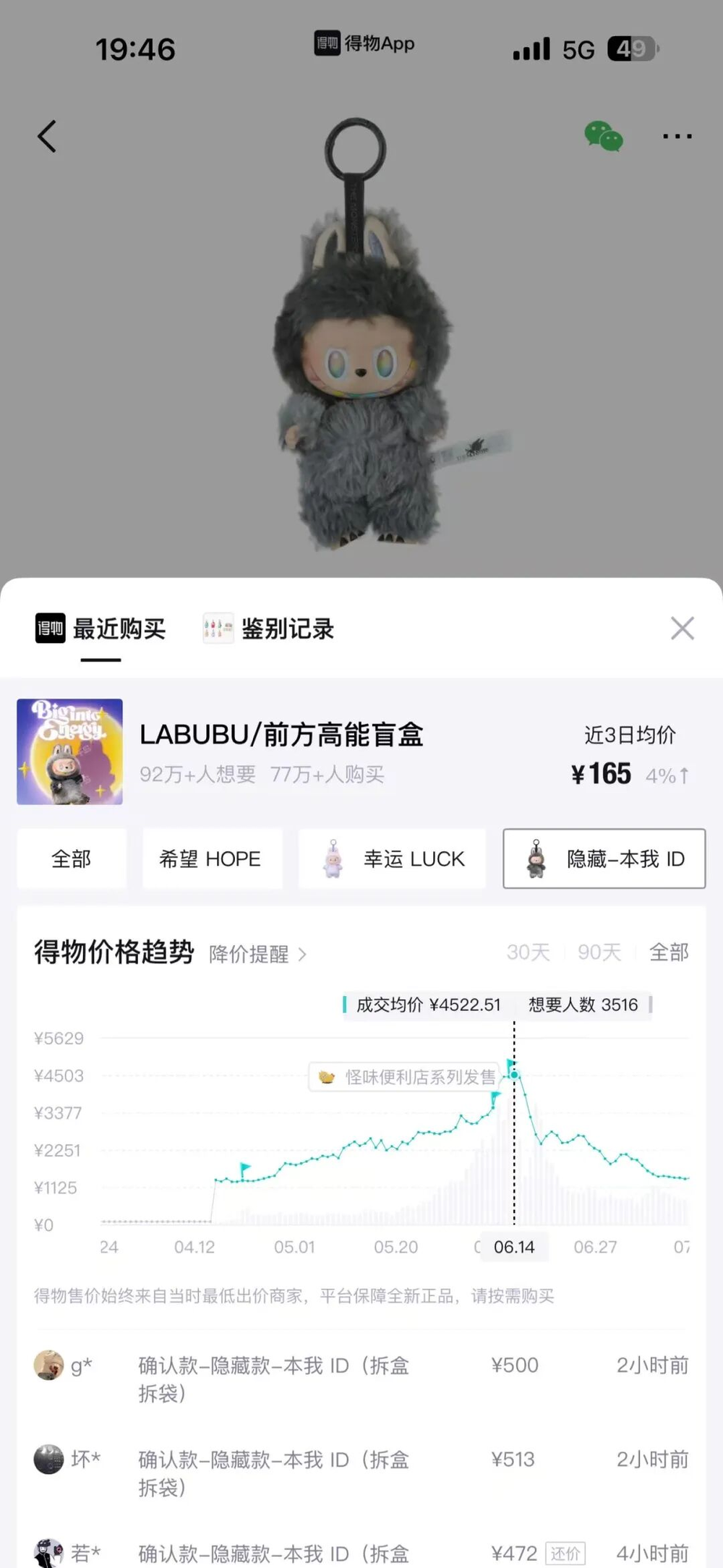 得物App数据显示,泡泡玛特旗下三大热销IP为THE MONSTERS、MOLLY、SKULLPANDA,同时LABUBU、星星人、CRYBABY为三大增速最高的IP。其中销量最高的产品为LABUBU“前方高能系列”,销量超过77万件,有92万用户“想要”,隐藏款“本我”市场成交价由99元上涨至最高4522元,溢价45倍,目前隐藏款售价仍然高达502元,溢价4倍。