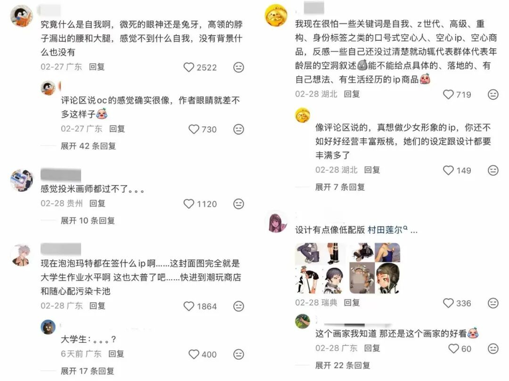 在官宣KeyA的评论区里,充斥着各种关于形象着装暴露、疑似借鉴、像设计师本人的质疑,“谁会花钱买她的OC(个人原创角色)”“设计有点像低配版村田莲尔(日本知名插画家)”“高领的脖子、露出的腰和大腿,感觉不到什么自我”“封面图是大学生作业水平,太普通了”。