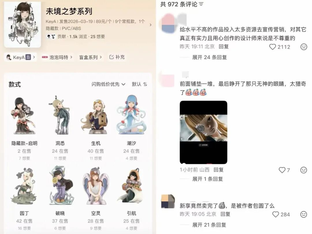 左图为千岛KeyA页面截图,右图为泡泡玛特官宣KeyA视频评论区截图
