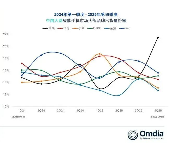 Omdia数据显示,苹果当季市场份额达到22%。多数中国品牌均出现明显下滑,荣耀在六大头部品牌中排名最末。