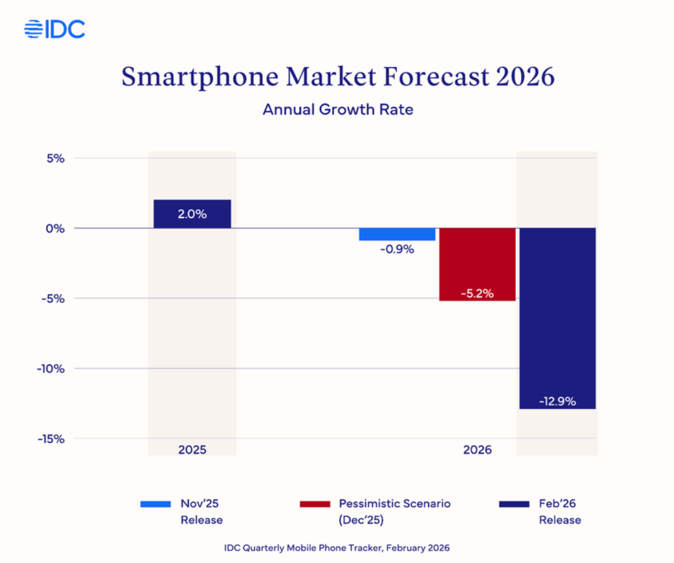 2026年初,Gartner与IDC两大机构一致预判智能手机行业将进入结构性收缩。Gartner预测2026年全球智能手机出货量下降8.4%。