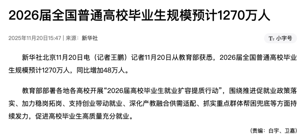 2026年,全国高校毕业生规模达到1270万。