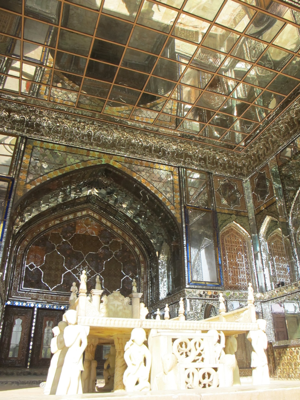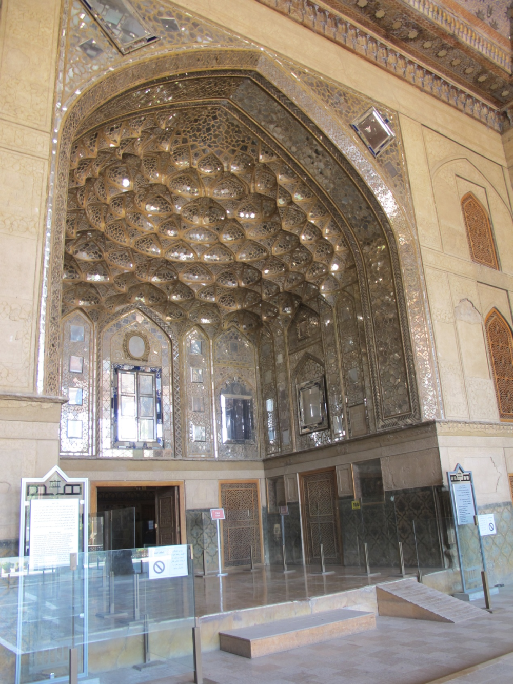 最有趣的是,伊朗人把欧洲的玻璃镜加以充分运用,将玻璃镜割成无数小片,贴在室内的墙壁和天花板上。王宫、大清真寺以及一些豪宅竟用玻璃镜片把穹顶内面、墙壁、柱体、天花板贴满,形成一座又一座镜光璀璨的大厅。有些高大空间更在穹顶里堆满层层花拱,再贴上镜片,迷离闪烁,真如水晶宫落到人间。