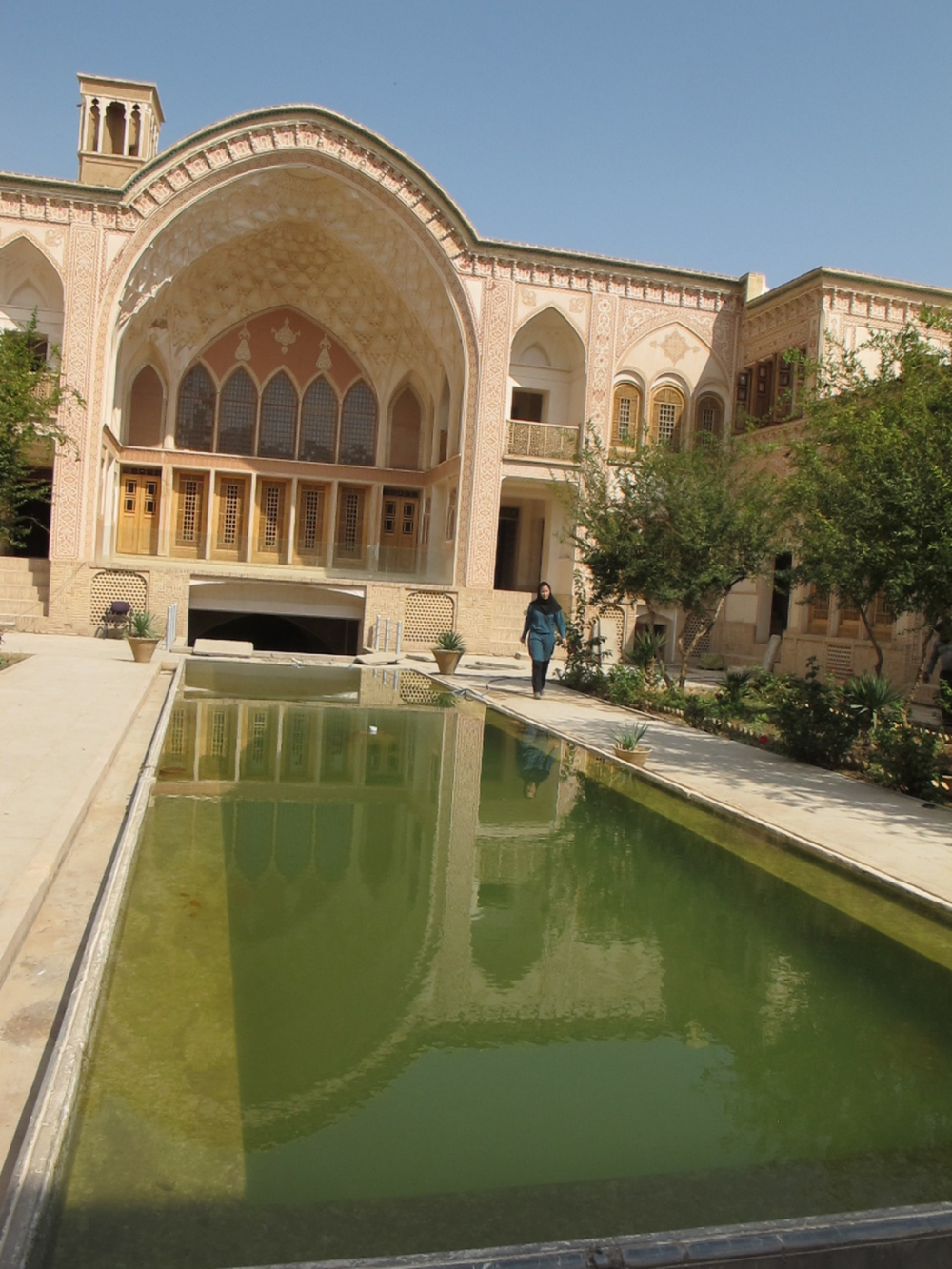 这种设计直接影响到传统建筑布局。在伊朗,宫殿、大宅、旅店等等,一般都在一处处庭院当中设有水池,围绕着水池,是类似“四合院”的围合式厅堂房舍,大小花园也都是以水池为中心。最妙的是,豪华宅邸内,会修造一至若干处半地下室,室内正中有一方水池,甚至有一座喷泉,摆上床榻和家具,到炎热的日子,人们便在这些地下室内消夏。伊朗人还进一步发明了“风塔”,在居室一角的暗渠之上砌高塔,塔顶部分有漏空的窄窗口,于是,热风通过那些窗口下沉,顺着水渠涌到室内,过程中由水降温,形成类似空调的效果。