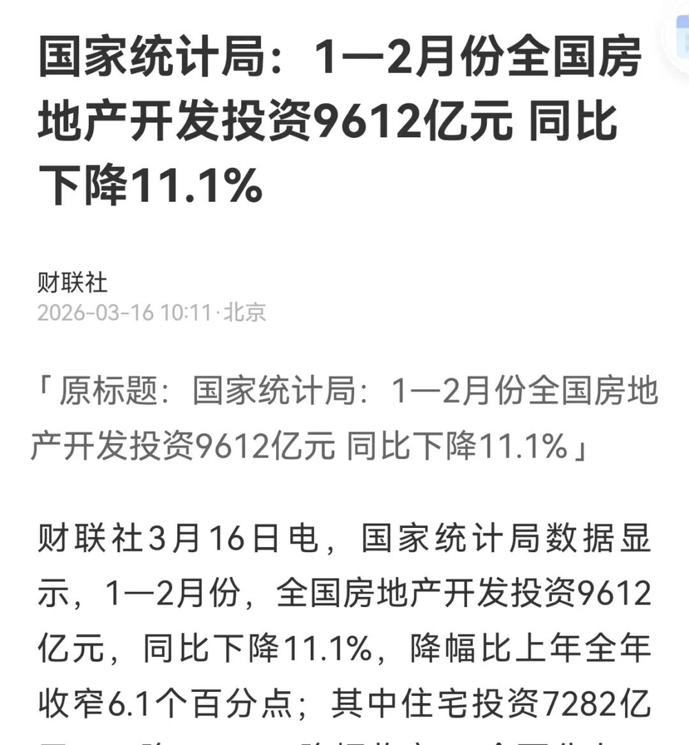 正好,今天国家统计局又出数据:1-2月份全国房地产投资同比下降11.1%。