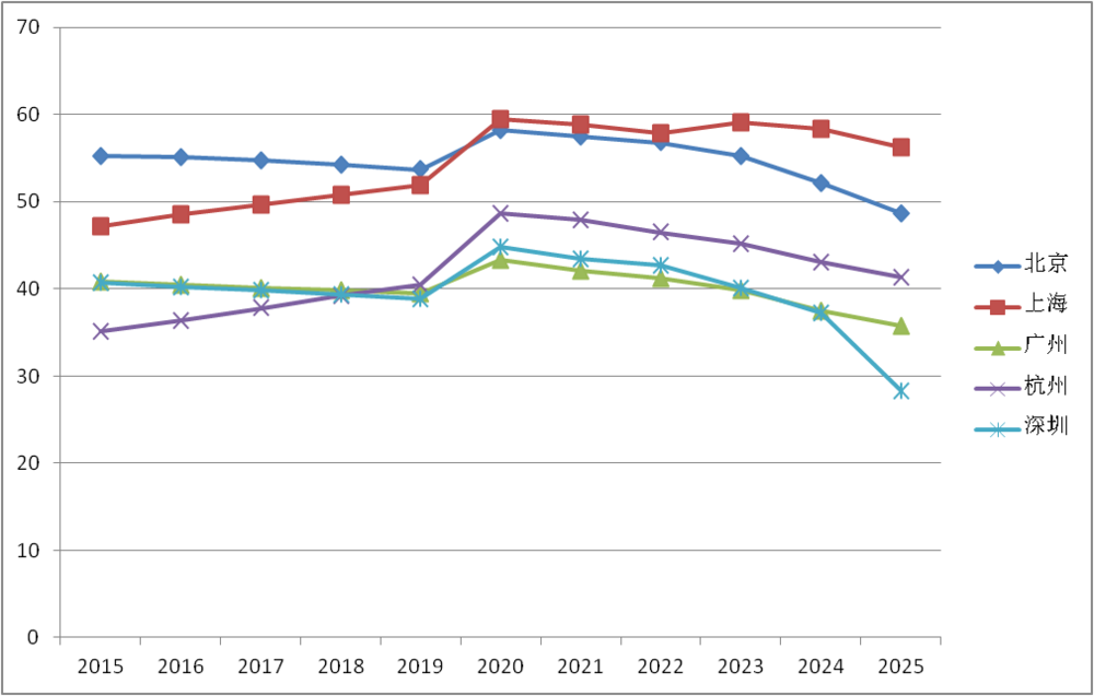 横向比较来看,深圳这一指标远远低于北上杭等城市。除广州外,其他城市房地产投资占比都在40%以上。