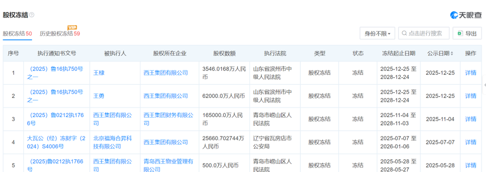 天眼查最新数据显示,截至2026年3月15日,西王集团仍有4条被执行人信息,被执行总金额达25.98亿元。此外,该公司还有50笔股权冻结信息,其中多达24笔股权冻结发生在2025年。