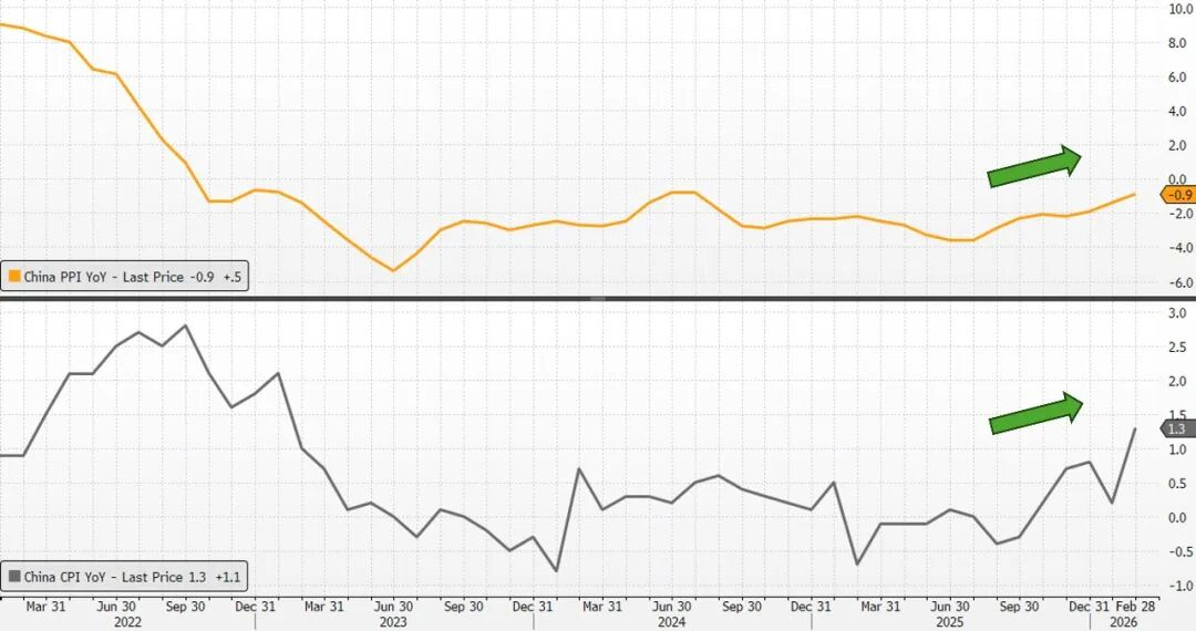 中国内地2月CPI同比升至1.3%,较前期有所回暖,1-2月社零同比增长也略微回升至2.8%;PPI同比-0.9%,虽然跌幅收窄,但主要贡献来自上游原材料的涨价,并非消费品与工业品的需求增加。整体看,这轮消费回暖和通胀回升更多受春节错位、出行服务和部分消费品价格带动,更像是阶段性修复,而不是居民消费能力和消费意愿的全面回升。这意味着当前价格端的改善还不足以支持“内需已经明显转强”的判断。