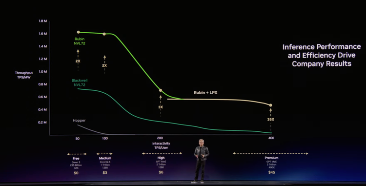 然后他把四代硬件的曲线叠上去。Hopper只能覆盖Free和Medium层,在高交互区间曲线贴着底部。Blackwell大幅上移,让Premium层变得经济可行。Vera Rubin再上一档。加上Groq LPX之后,曲线在400+TPS/User的高交互区间向右延伸出去,对比Hopper提升35倍,让一个目前还不存在的Ultra层(150美元/百万token)成为可能。
