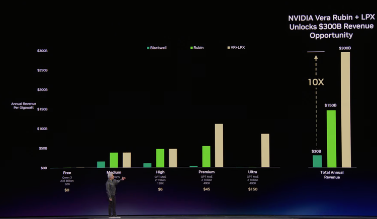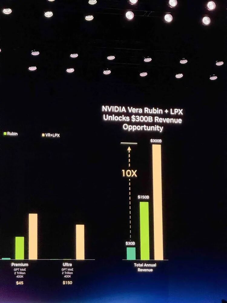 假设一个1GW数据中心按25%算力分配给每个层级,每GW年营收Blackwell能做300亿美元,Rubin做1500亿(5倍),加上Groq LPX做3000亿(10倍)。