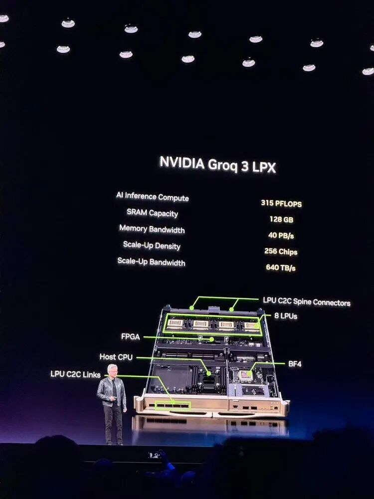 但今晚真正的新闻是第七颗芯片,Groq 3 LPU。去年圣诞夜英伟达花200亿美元拿下Groq的技术授权和核心团队,今天是首次产品落地,而且已经在量产。