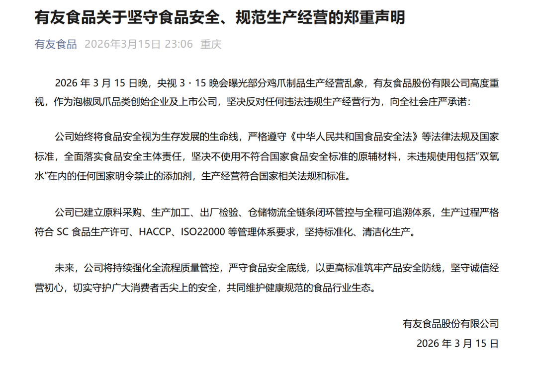 央视3.15晚会“漂白鸡爪”报道播出后,席卷整个泡椒凤爪行业。有友食品(603697.SH)作为行业龙头、泡椒凤爪第一股也坐不住了。公司连夜紧急声明,强调并未使用双氧水等在内的任何国家明令禁止的添加剂,产品全链路品控可追溯,试图稳住市场信心。