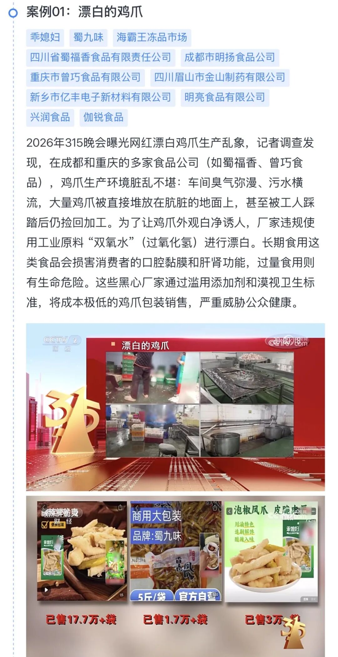 此次事件主要涉及四川蜀福香食品、重庆曾巧食品及成都明扬食品等3家企业。央视记者通过暗访调查证实,这些企业涉嫌违规利用双氧水漂白鸡爪。