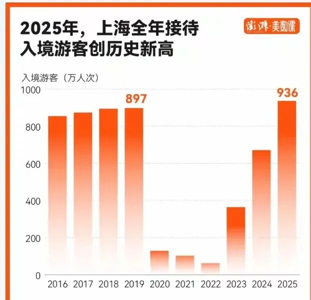 2025年,上海全年接待入境游客936万人次,同比增长近四成,终于超过了2019年的897万人次。