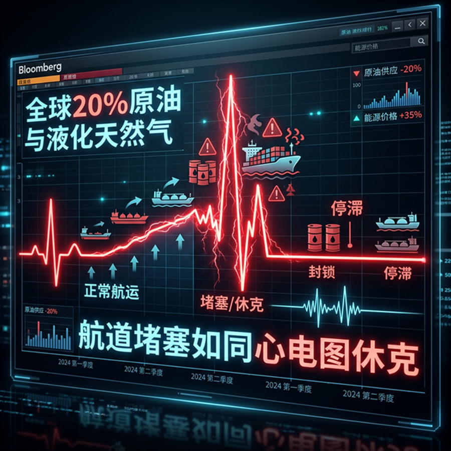 接下来看看这张极其冷酷的全球经济联动推演图表。这条窄窄的裂缝,每天都必须不间断地超负荷输送全球20%的原油,和足足五分之一的液化天然气(LNG)。它就像是一个患有重度心血管狭窄的病人的最后心电图,绝不能有一丝停跳。