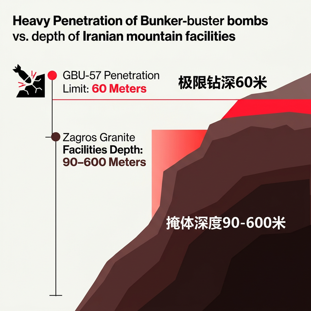 图片的左上部分,代表着目前美军武库中引以为傲、威力最大的非核重型钻地弹——重达13吨的GBU-57(MOP)。这枚造价千万美元的钢铁巨兽,在面对高强度花岗岩山体时,理论钻地极值被死死卡在了红线标注的60米左右。