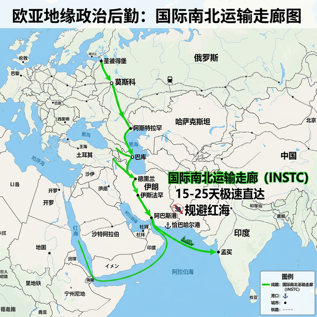 图表中央那条贯穿欧亚的绿色极速高亮带,就是全长7200公里的“国际南北运输走廊(INSTC)”。它的逻辑非常简单粗暴:俄罗斯的煤炭、木材和粮食,印度的化肥和轻工业品,在这个制裁时代不再去走危机四伏、淤泥深陷的苏伊士旧路,而是直接以伊朗为绝对的地理中转枢纽,通过里海港口和伊朗贯通南北的铁路网络进行陆海直达。