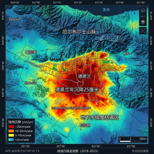 看一眼上面这种犹如大地震灾前预警遗址般的严重沉降红温地图。这里划定的高危区域绝对不是什么边远的荒漠无人区,而是这个国家绝对的政治和经济心脏——首都德黑兰及周边平原带。
