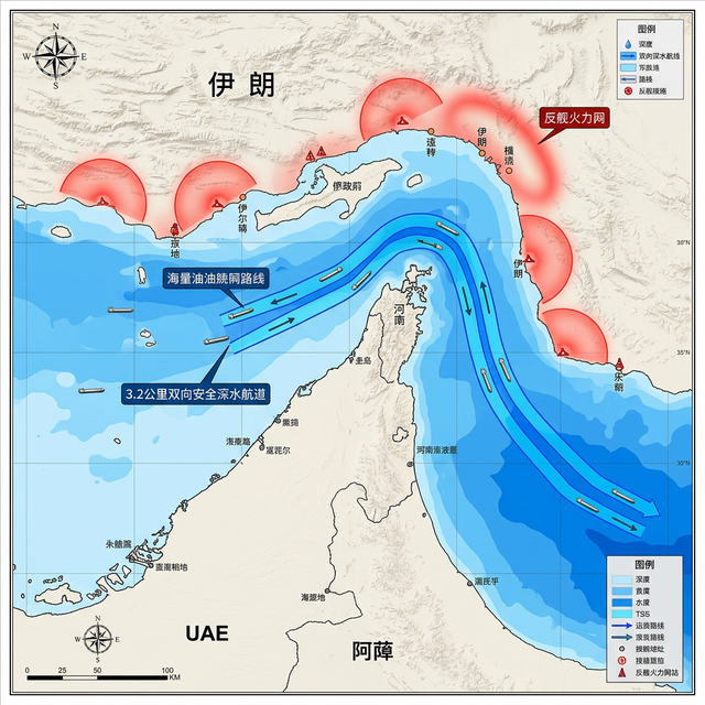 【图5:霍尔木兹海峡3.2公里极限深水航道TSS区与高地火力网标注图】