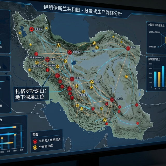 但伊朗的做法是彻底打散。就像我们在图表上看到的那些密密麻麻、如同星斑一样的红色生产节点分布:他们依靠扎格罗斯山脉的物理掩护,将庞大的无人机生产能力,粗暴地分解成了数百个分布在地下防空洞、普通民房甚至是山间隧道里的中小型组装单元。核心思路就是:通过从阿曼和阿联酋的灰色航道走私进来的民用散件,在这个如同迷宫般的地下生产网络中进行搭积木式的组装。