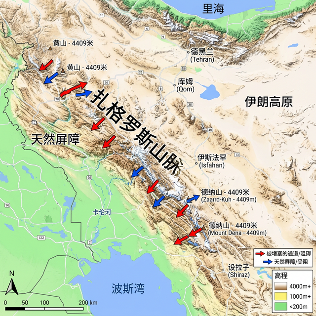 【图1:扎格罗斯山脉明快级地势测绘与红蓝战术隘口阻滞图】