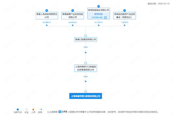 拜博口腔的实际控制人,正是中国保险业巨头泰康保险集团。2018年,原银保监会批准泰康人寿出资逾20亿元购入拜博医疗51.56%股权,泰康系由此成为这家全国性口腔连锁机构的绝对控股方——截至2026年3月,泰康人寿保险有限责任公司直接持有泰康口腔集团53.2881%股权,泰康健康产业投资控股有限公司另持24.4332%,泰康系合计控制77.72%股权;联想控股股份有限公司(03396.HK)持股21.2251%,退居次席;珠海金创医药产业投资基金(有限合伙)持股1.0535%。