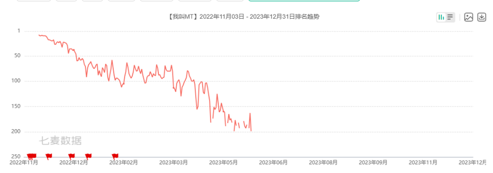 《我叫MT:归来》,是龙图押上的最后筹码。2022年11月游戏上线后,首月流水接近1亿,靠着这款产品,龙图续上了一口气,内部员工也一度以为,公司能靠着它熬过最难的日子。不到一年,IP用户热情就消耗殆尽,游戏收入很快跳水。