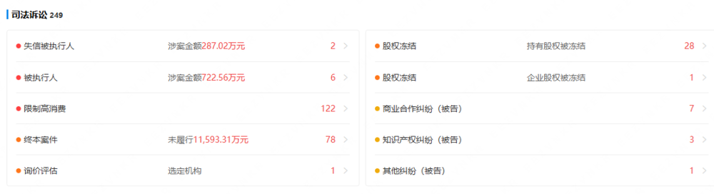 企查查公开信息显示,截至2026年3月,龙图近几年累计涉诉案件超249起,其中作为被告的商业合作纠纷122起;公司累计收到122条限制高消费令,78起终本案件,未履行金额累计超1.15亿元。