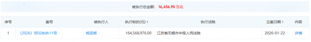 如今杨圣辉个人名下已累计关联372条司法案件信息,从2023年开始,他接连被纳入被执行人、限制高消费名单。2026年1月立案的巨额执行案,执行标的高达1.64亿元,杨圣辉作为第一被执行人,需承担全部连带清偿责任。