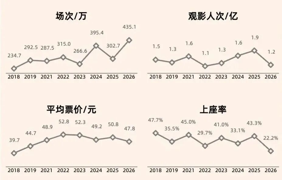 灯塔研究院数据显示,不久前落幕的2026年春节档平均票价已经降至6年来最低水准,约为47.8元,明显低于2022年春节档52.8元的均价高点。全年来看,2025年的平均票价也要低于过此前年。
