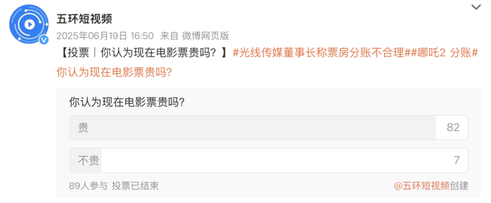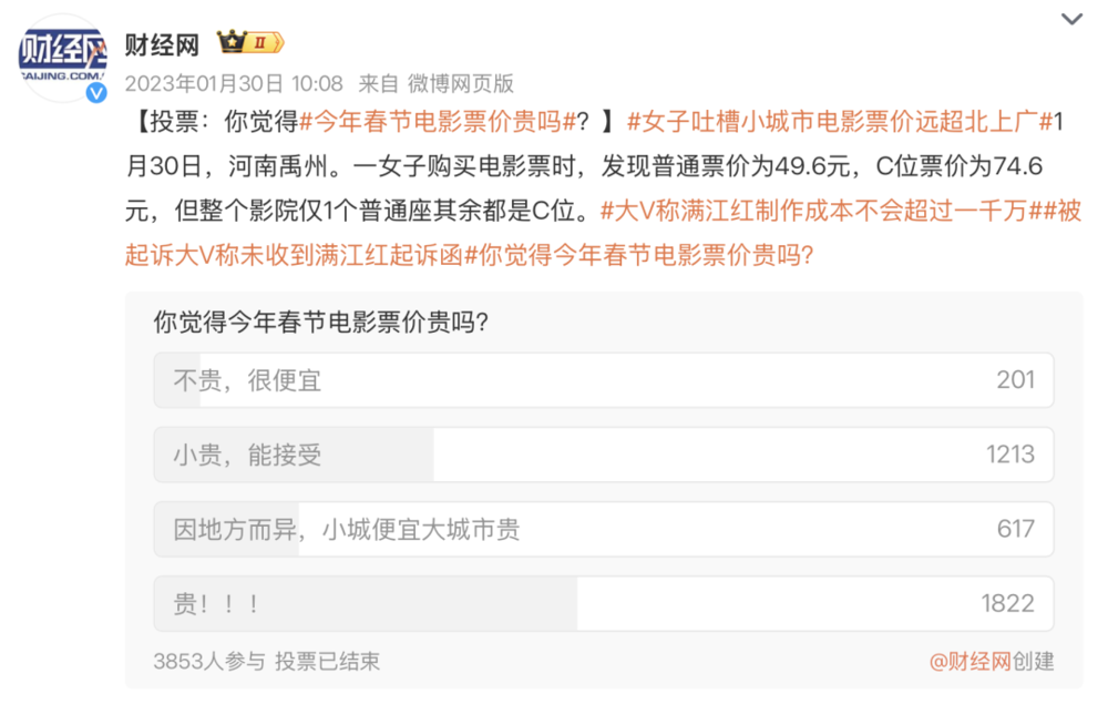 与此同时,另一个有趣的现象是,结合社交平台上的种种投票、讨论来看,大众用户并未真切感知到电影票的降价现象,票价贵才更符合多数人的体感或者说印象。