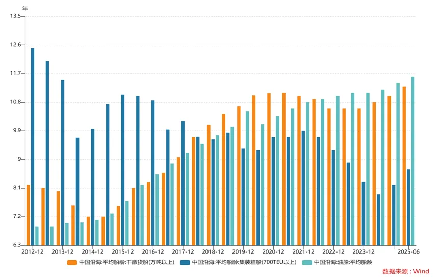 下图清晰地揭示了当前船龄结构的现状:以中国沿海为例,干散货船及油船的平均船龄已分别攀升至11.3年和11.6年,这预示着未来十年将是更新需求的密集释放期。