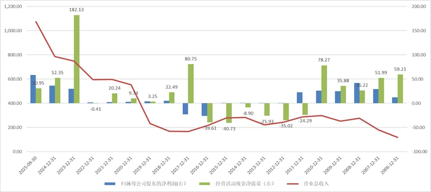 ●营业收入于2010年触及298.55亿元的阶段性高点后,便步入长达数年的下行通道,2017、2018年一度跌破170亿元。直至2020年后方见修复,2025年前三季度合并口径营收已达1074.03亿元。