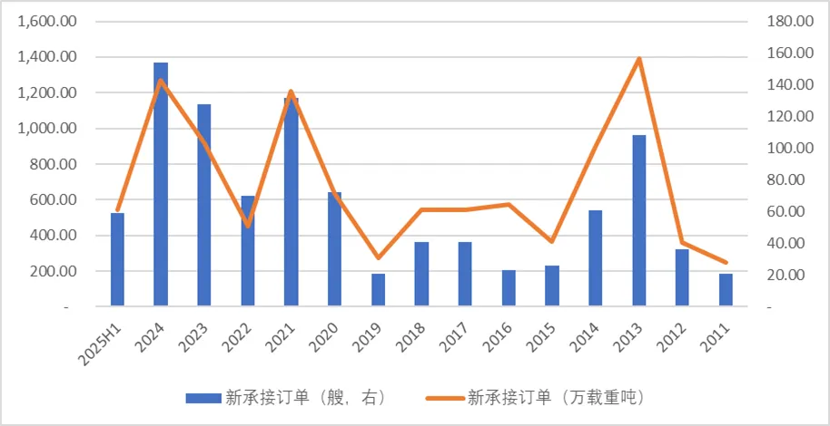 存货周转天数的显著延长(2021年以来)似乎揭示了答案的一角:在手订单的迅速攀升——截至2025年半年报,手持订单按万载重吨计约为2019年的2.82倍——占用了大量营运资金,利润的释放滞后于订单的承接。