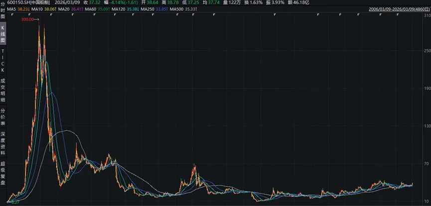 截至2026年3月17日,中国船舶收盘价为34.4元。然而,将K线图向前复权20年,那座在2007年牛市巅峰创下的近300元(前复权)股价高峰,至今仍像一座遥不可及的墓碑,矗立在行业周期的轮回之中。