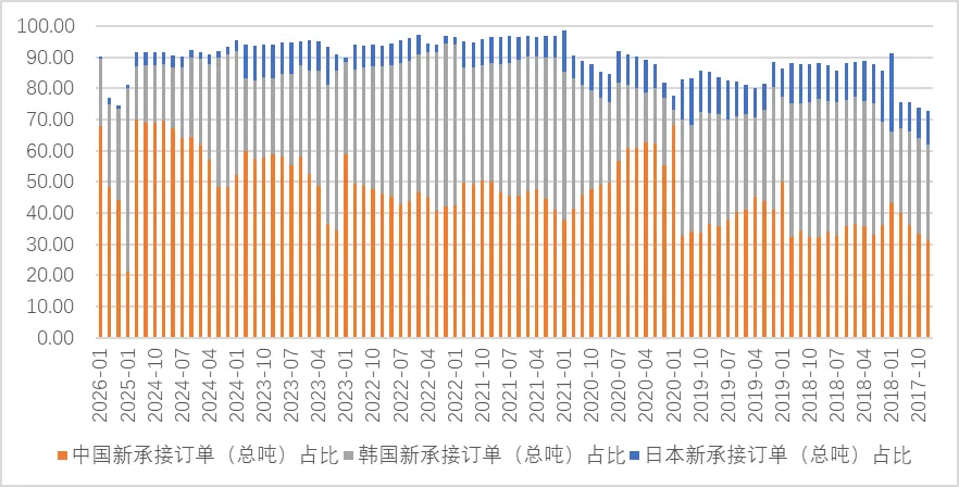 图:中韩日三国新接承船舶订单(修正总吨)在全球中的占比,据来自wind