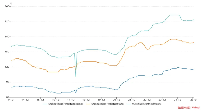 图:全球新造船价格指数——以散货船、集装箱船及油船为例