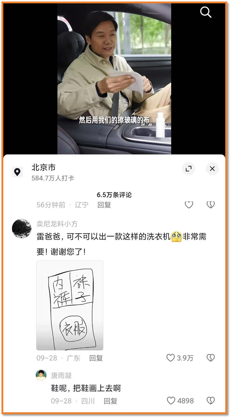 很快,就有网友在雷军的社交账号下,手绘了一张简单直白的示意图:一台洗衣机,左边大圆圈标注“衣服”,右边小圆圈标注“内裤袜子”,配文直言“雷总,能不能造这个?”。