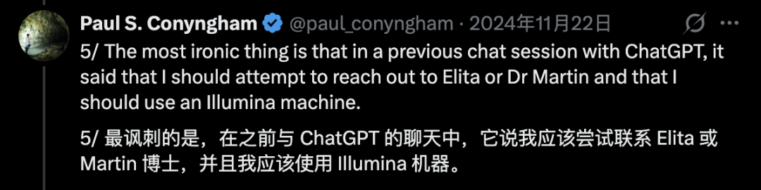 巧合的是,之前ChatGPT在聊天里就建议过他去联系Elita或Martin Smith,并推荐用Illumina。