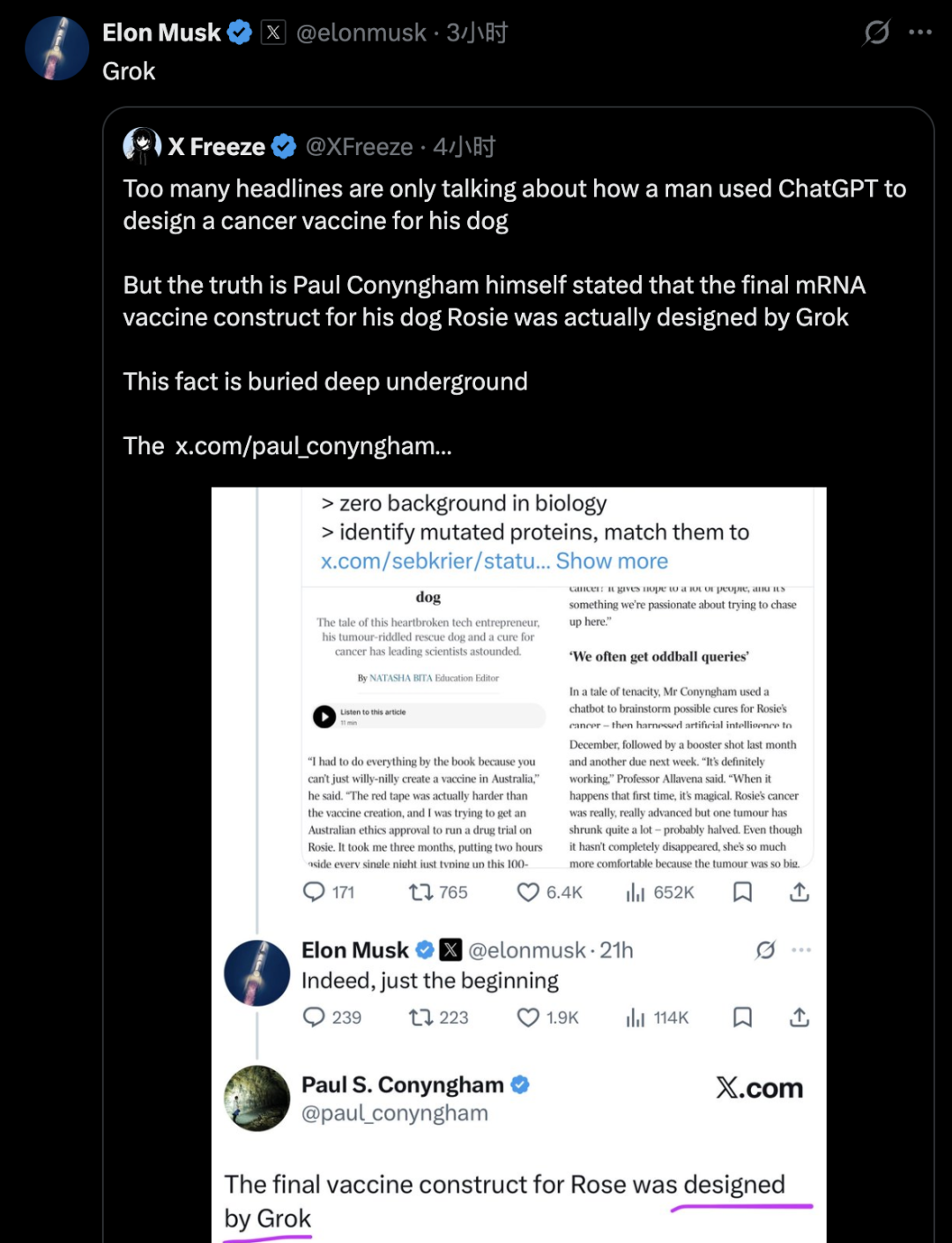 甚至连马斯克都忍不住下场转发,顺手还要抢一句功劳,强调这事的主要功臣其实是Grok。