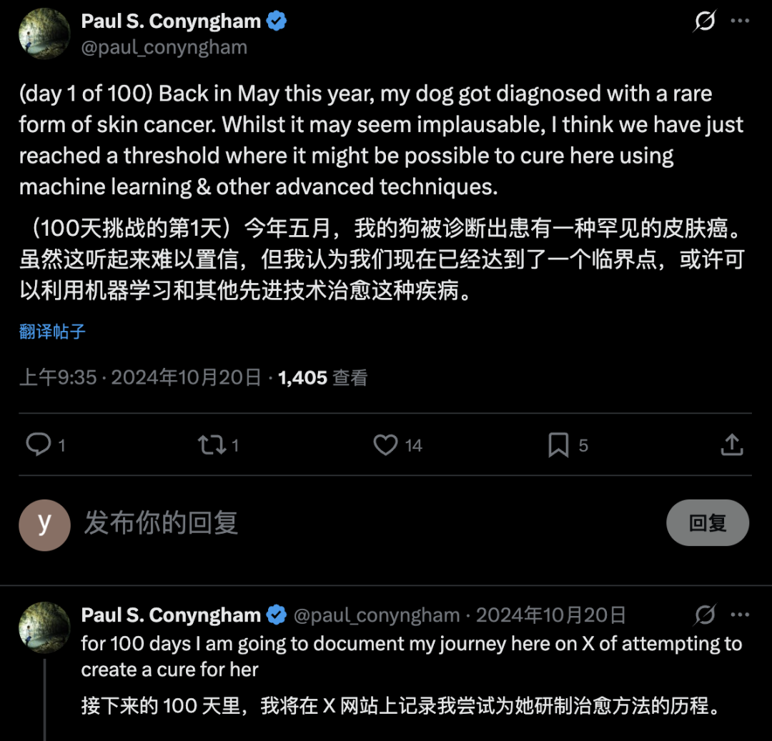 他在X上把这件事定义成一个近乎不可能的目标:用机器学习和更先进的方法,把Rosie从死亡线上拉回来。